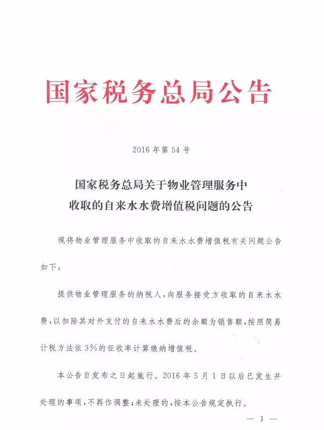 国家税务总局关于物业管理服务中收取的自来水水费增值税问题的公告