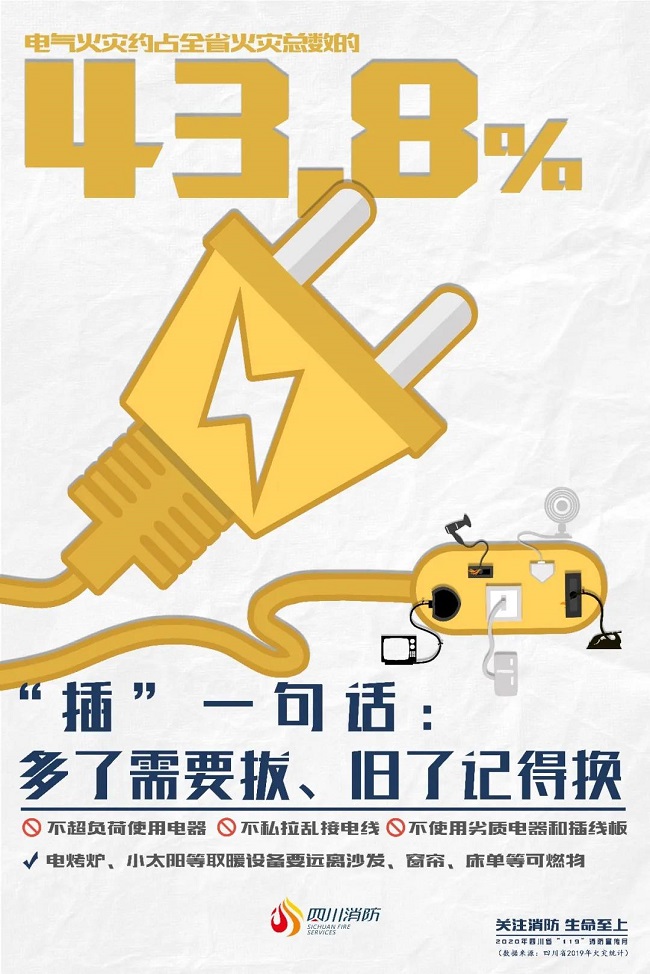 2019年,四川省共发生火灾14249起,电气火灾达6244起,占全年火灾总数的43.8%,造成20人死亡和57人受伤,直接经济损失达8112万元。
