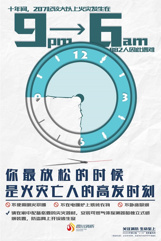 晚9点到次日6点是冬季大火的高发时段,凌晨2点到4点间尤其危险。冬季昼短夜长、天气寒冷,人们多在室内,早睡晚起,警觉性低,浓烟中惊醒的人们,很难快速反应,因而夜间火灾大多伤亡惨重。事实上,夜间火灾一直是四季消防之顽疾。