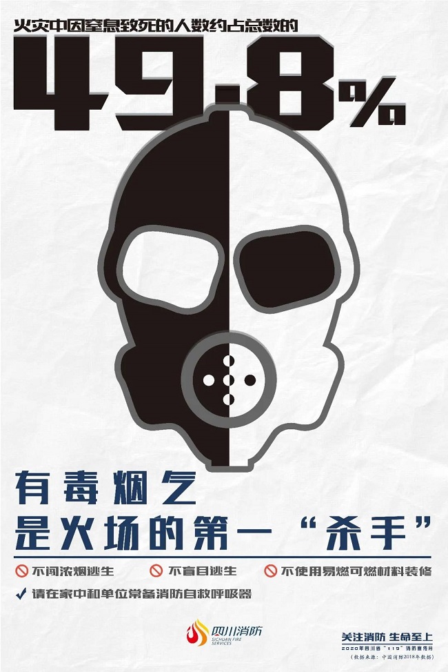 很多亡人火灾被误认为是被火烧死的,其实浓烟才是真正的“杀手”。有数据表明,在火灾中因窒息致死的占总数的49.8%。