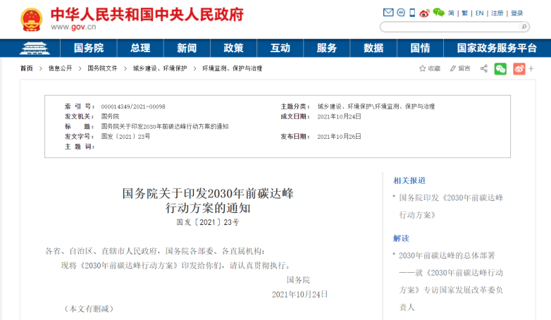 现将《2030年前碳达峰行动方案》印发给你们,请认真贯彻执行。