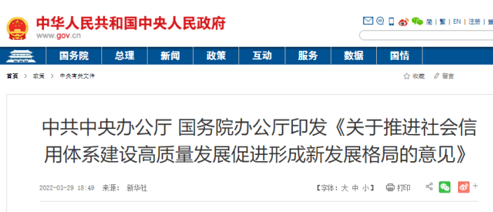 《关于推进社会信用体系建设高质量发展促进形成新发展格局的意见》全文如下。
