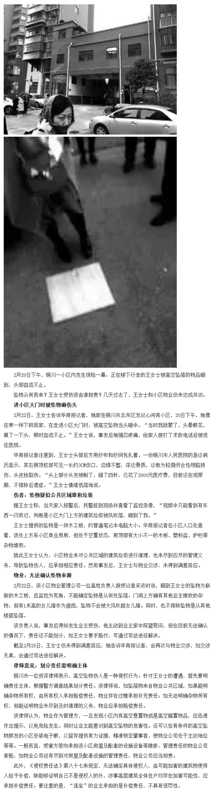 女子遭小区高层坠物砸伤 血流不止找不到责任方