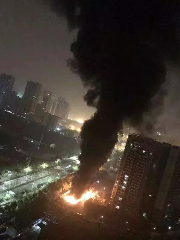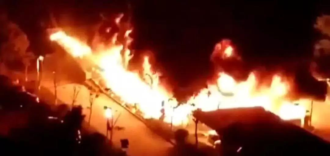 通过现场情况我们可以看到,整个天空都还是黑色,车棚里火苗的橘色映得四周亮如白昼。