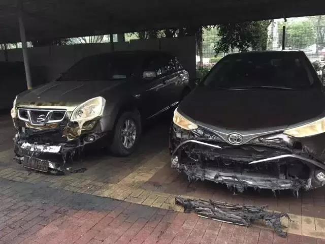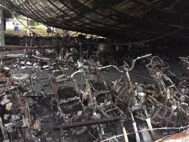 整个车棚已经垮塌,车棚内约300多辆电动车都已被烧毁,还有十几部汽车不同程度被烤伤。