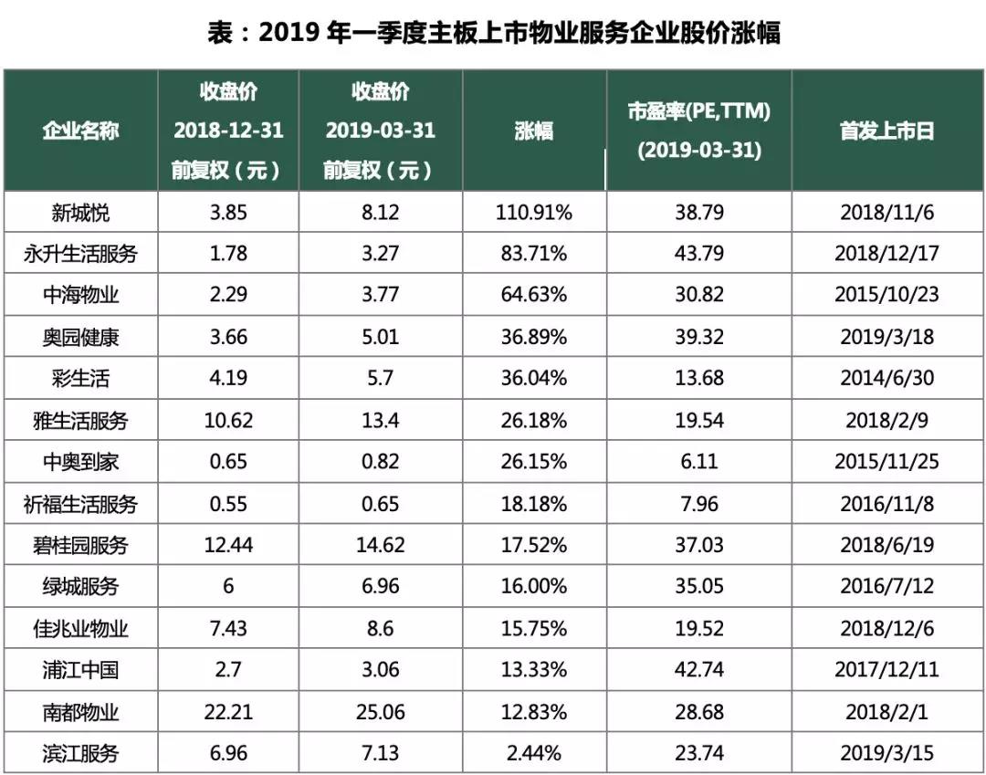 截止2019年4月,在主板上市的物业服务企业达14家,仅今年3月份一周内就有连续两家物业服务企业成功上市。在主板上市的物业服务企业越来越多,资本市场对行业的认可越来越高,也形成了很好的板块效应,企业在资本市场的表现相应的也越来越好。