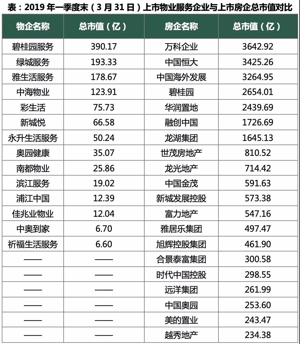 注:A股股价及市值单位为人民币,港股股价及市值单位为港币,奥园健康及滨江服务为2019年3月新上市,其涨幅为3月31日与上市日收盘价比较。